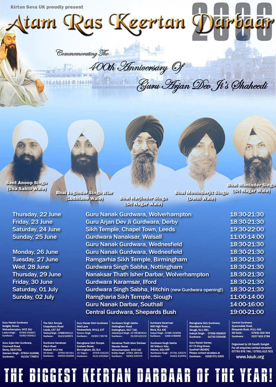 At the beginning of the year 2004, it was announced that the Atam Ras Kirtan Darbars, which had been happening in India up until then, were due to be held in United Kingdom for the first time. This really boosted spirits amongst sangat in England who were very excited about the prospects of such great Kirtani coming together for the first time, near their own homes. What they had seen only on DVD’s up until now was about to come to life. The Kirtanis announced included Bhai Harjinder Singh, Bhai Maninder Singh (Sri Nagar Wale), Bhai Joginder Singh Riaar, Sant Anoop Singh and Bhai Maninderjit Singh.